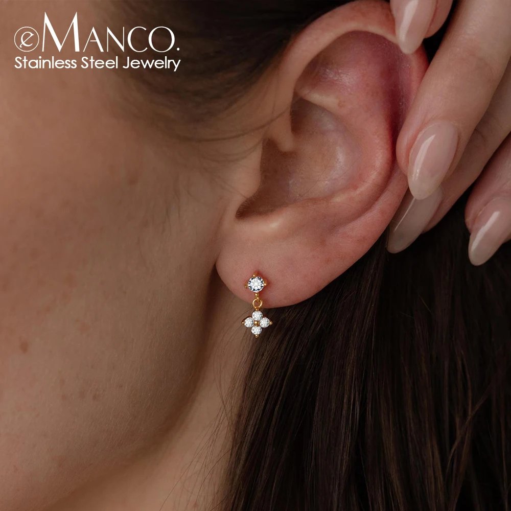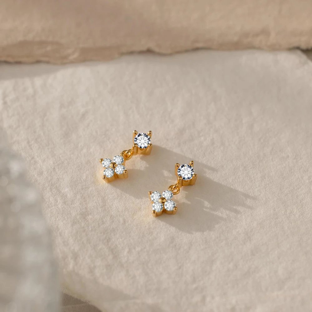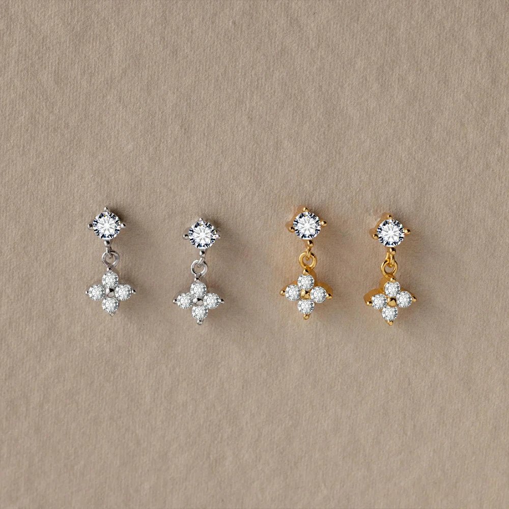 اقراط نسائية راقية بتصميم أنيق يتكون من فص لامع في الجزء العلوي يتدلى منه جزء سفلي على شكل زهرة رباعية الأوراق، مرصعة بأحجار زركونيا مكعبة لامعة. متوفرة بخيارات من الفضة الإسترليني