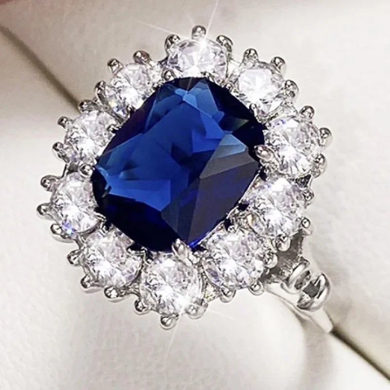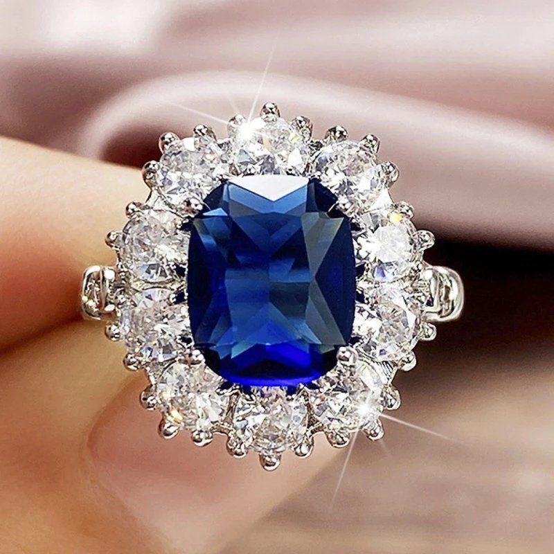 خاتم مميز أنيق وعصري، مزين بحجر ياقوت أزرق كبير محاط بهالة من الألماس أو الزركونيا لإطلالة فاخرة وجذابة لكل المناسبات الخاصة.