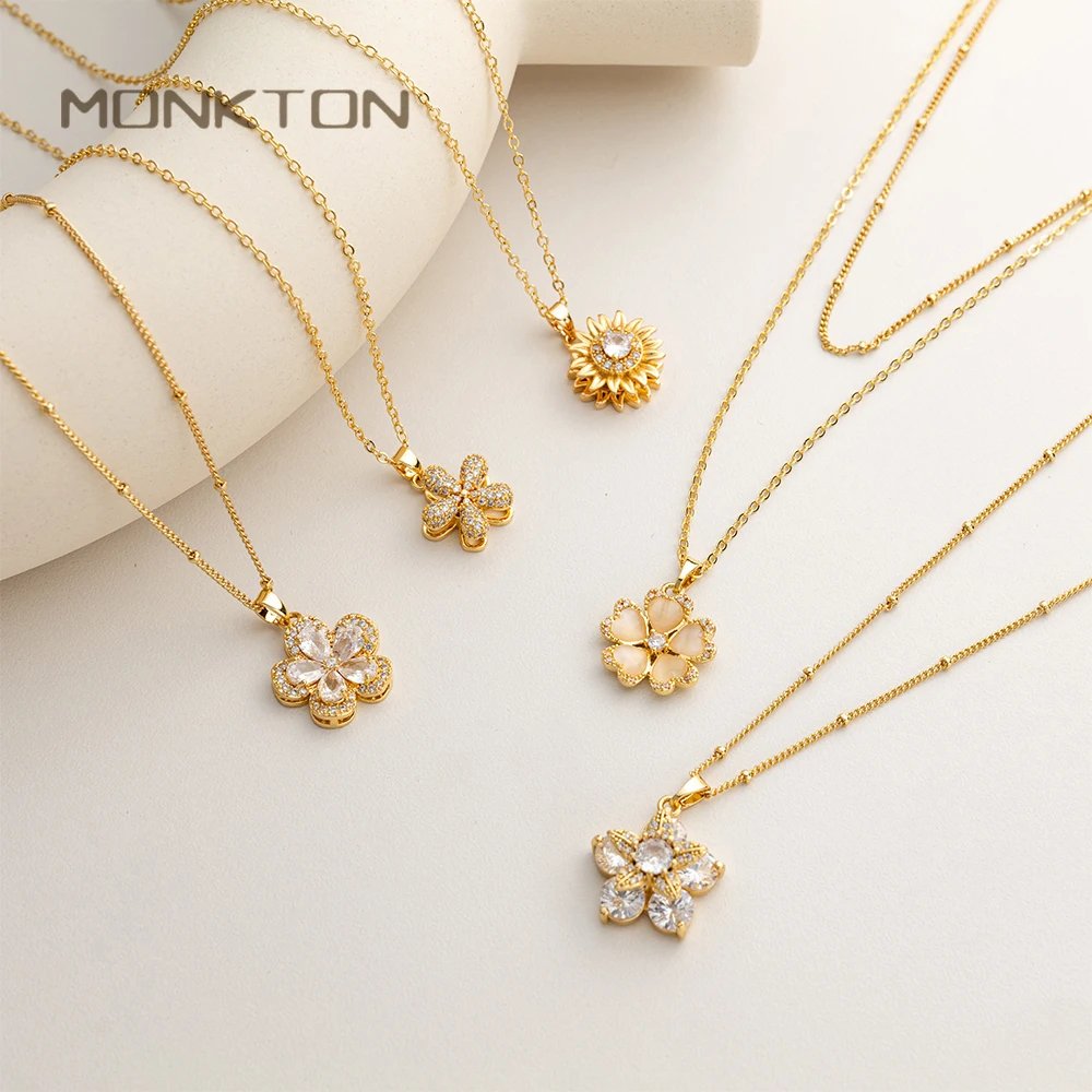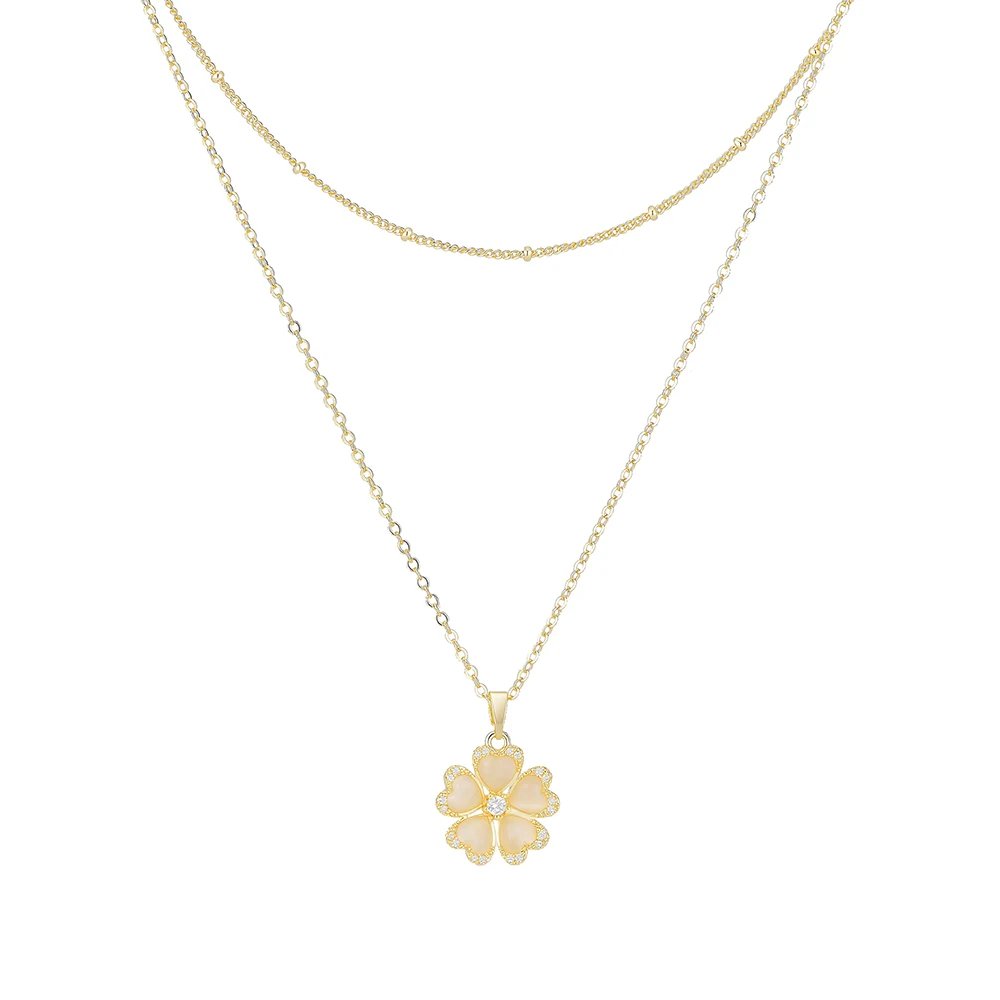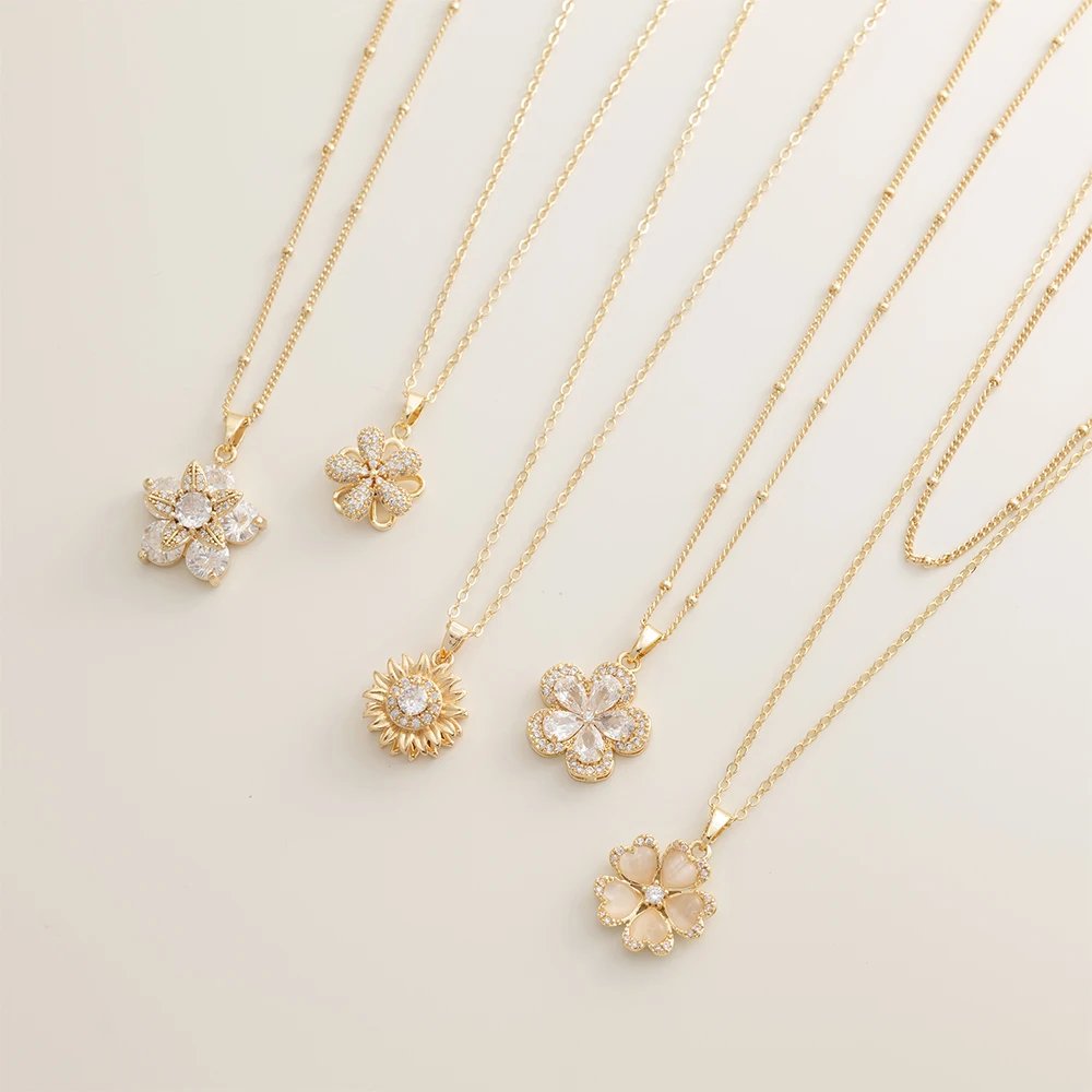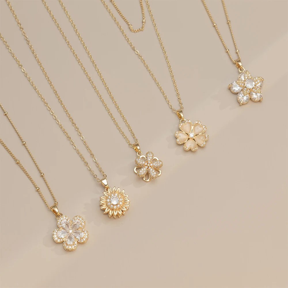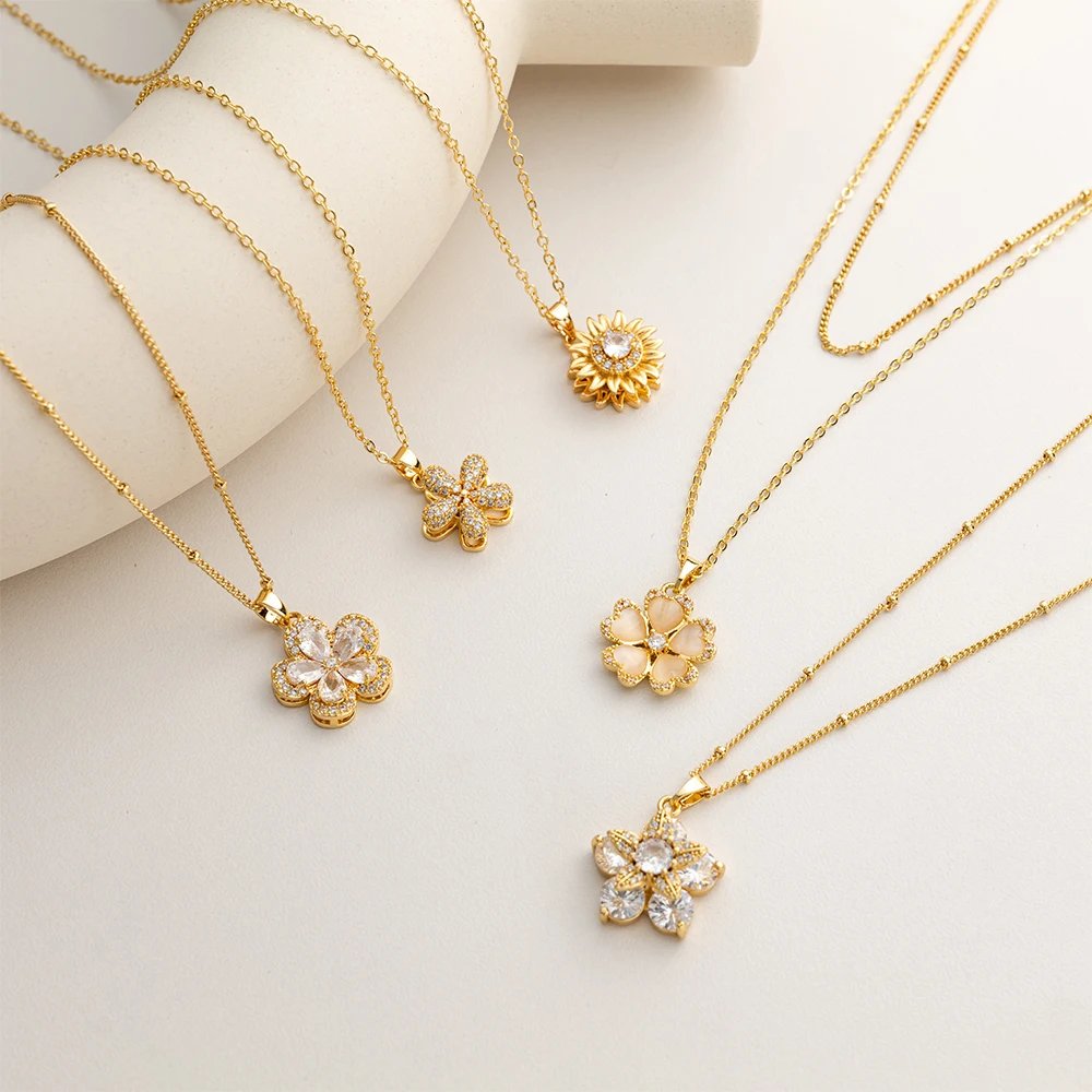 قلادة على شكل وردة تضيف لمسة أنثوية حيوية وأنيقة، مع بتلات مرصعة بفصوص كبيرة وتصاميم زهرة عباد الشمس وساكورا وورود برسيم، لتمنحك إطلالة متجددة وفاخرة.